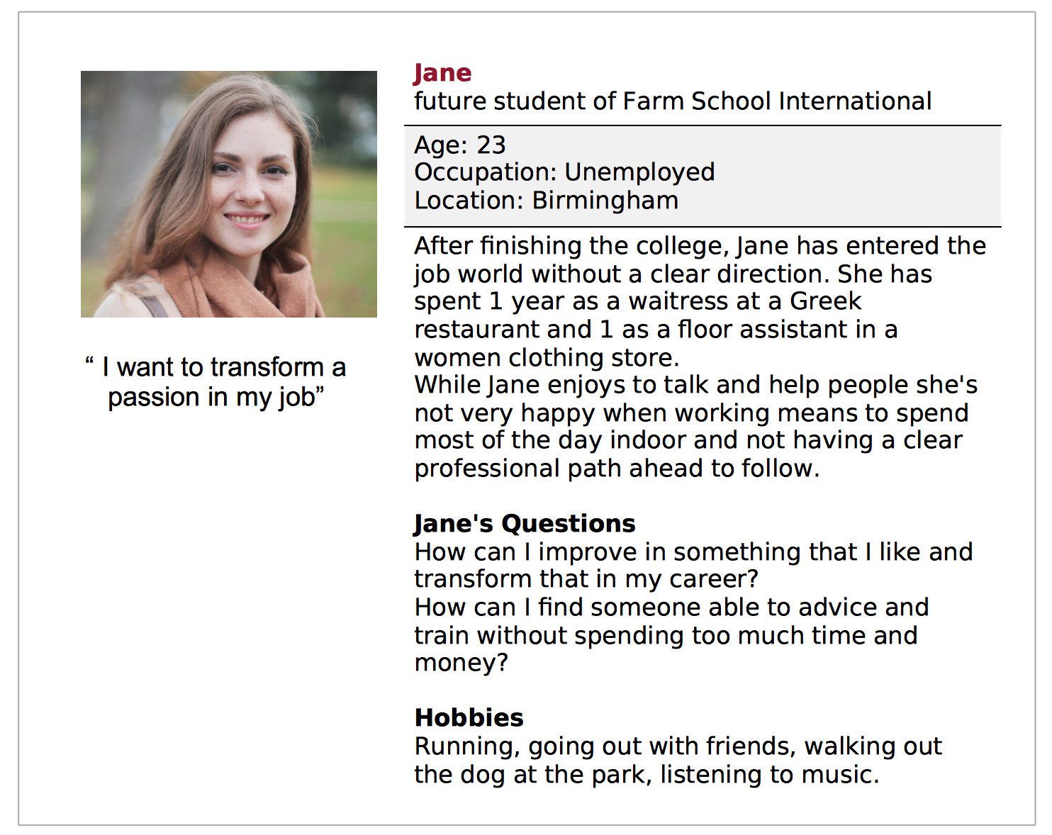 We have decided to focus on the user Unemployed Adult because he is the main target of the design of Farm School International website.